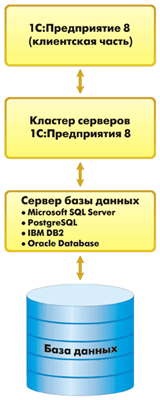 При использовании лицензии на сервер 1с предприятия 8 приложение на стороне клиента взаимодействует с кластером серверов 1С. Кластер, в свою очередь, посылает запрос серверу баз данных (PostgreSQL или MS SQL Server). При чем кластер серверов 1С:Предприятия 8 и сервер баз данных физически могут быть расположены на разных компьютерах. Это дает возможность администратору распределять нагрузку между серверами.